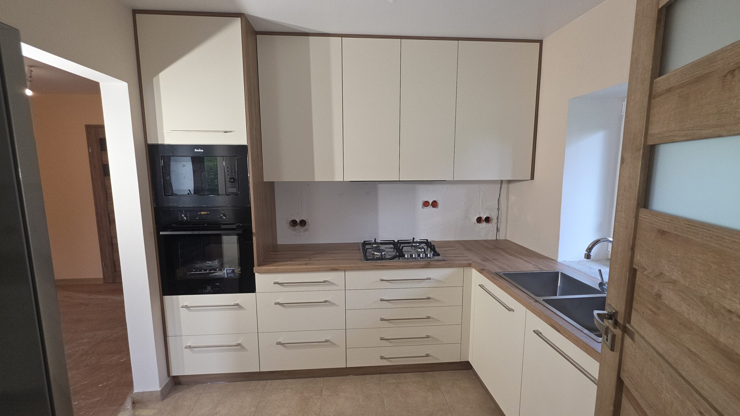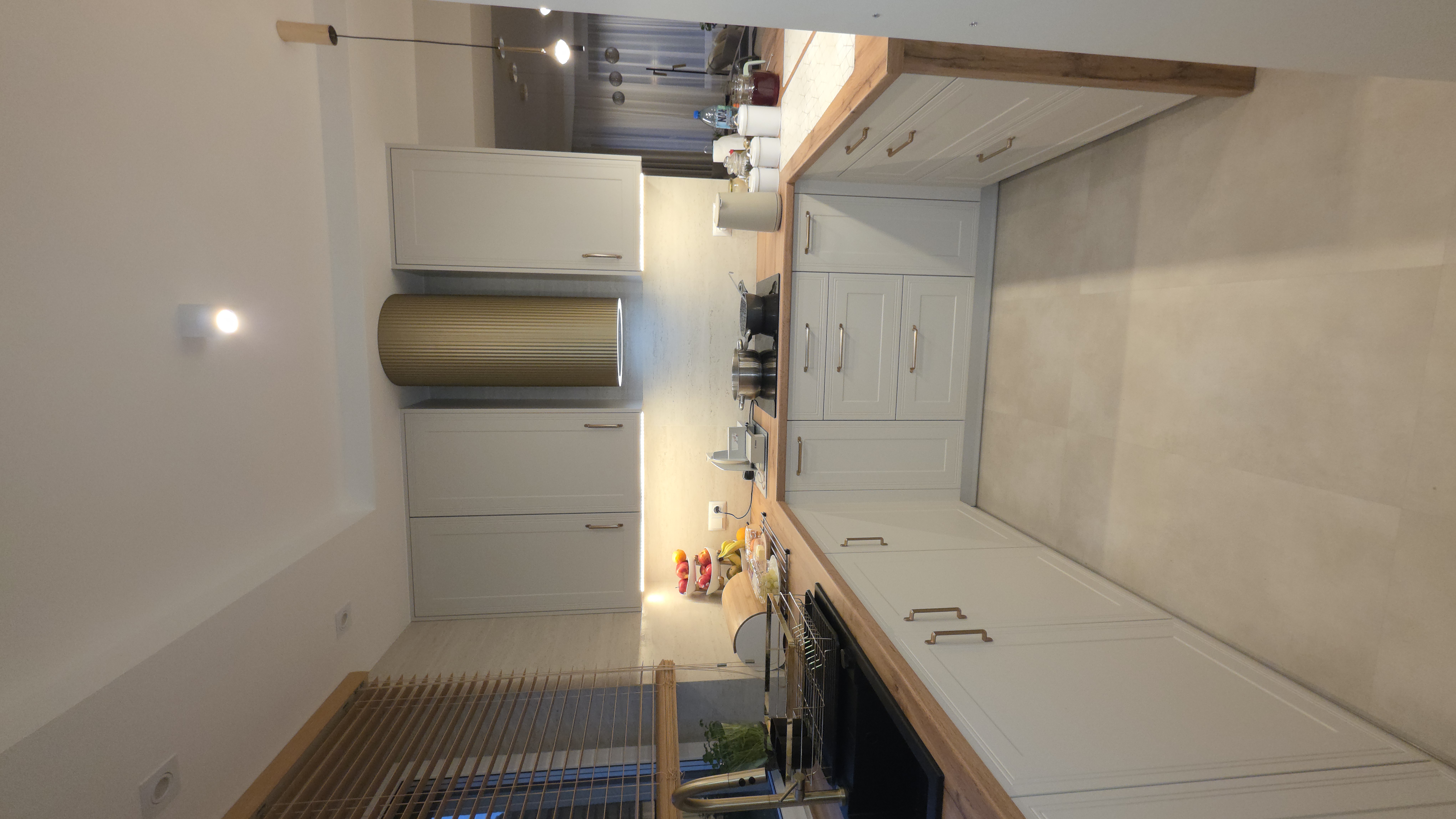 Elegancka kuchnia wykonana na wymiar z wysokiej jakości materiałów, łącząca funkcjonalność z nowoczesnym designem.