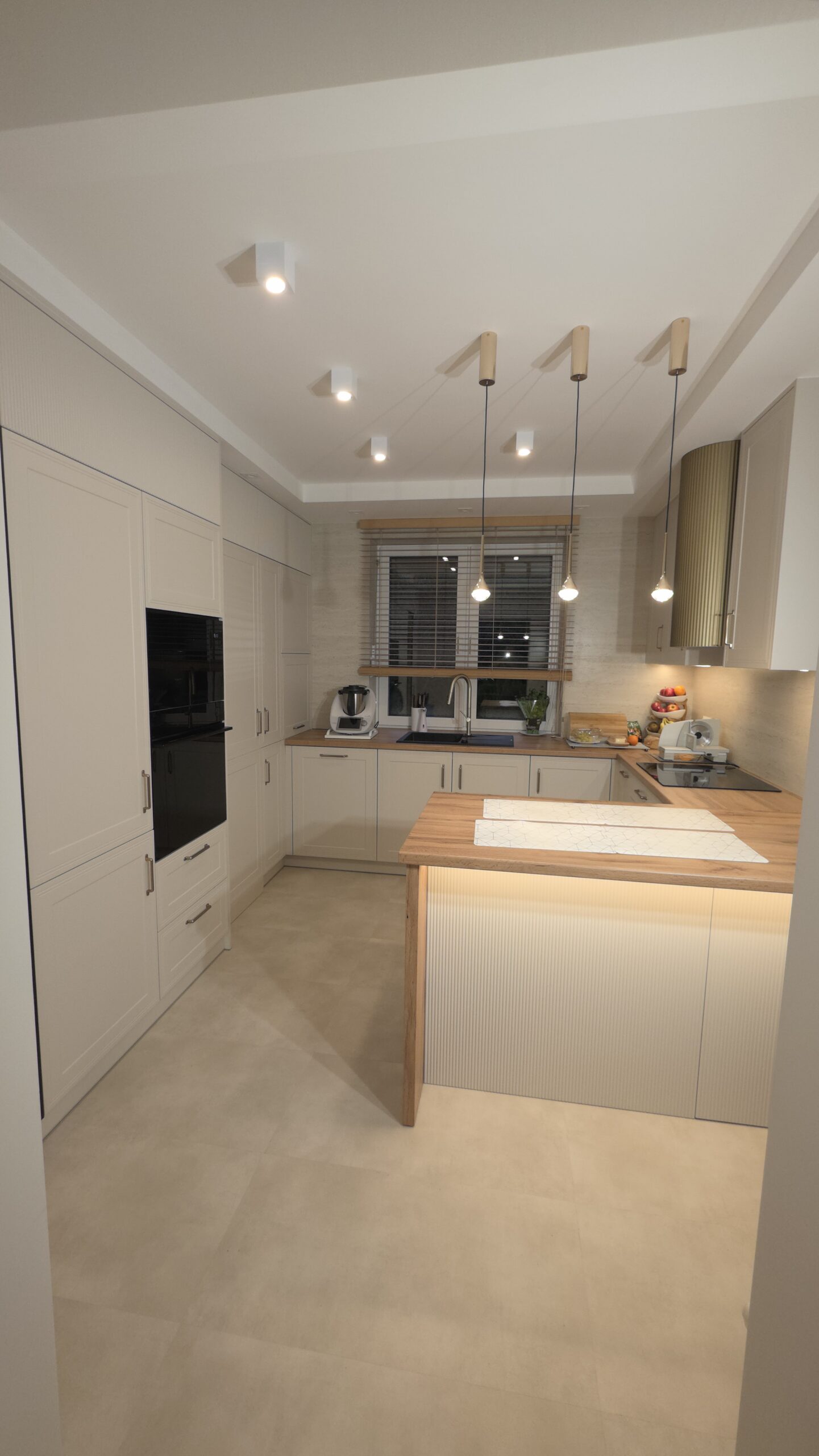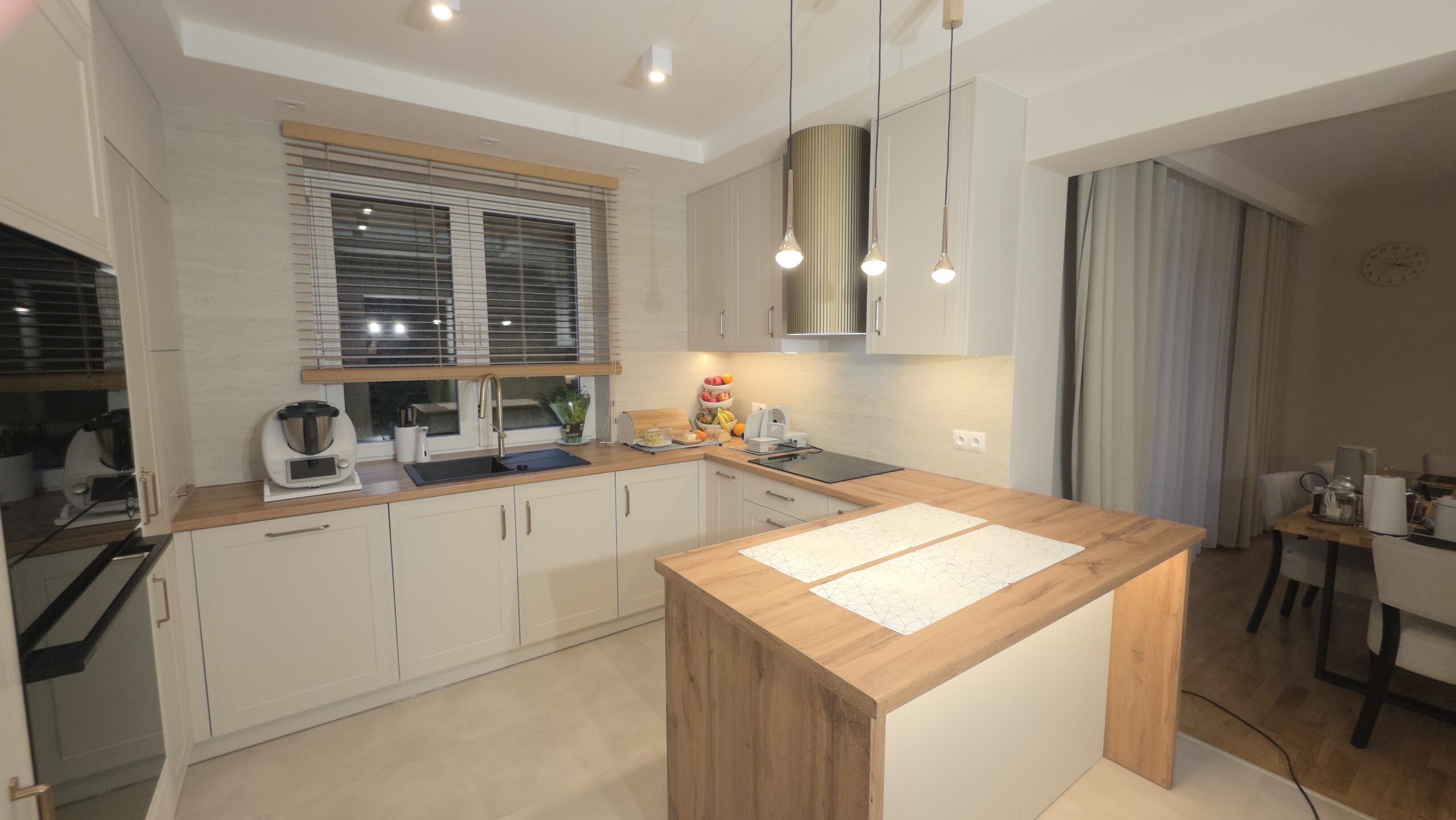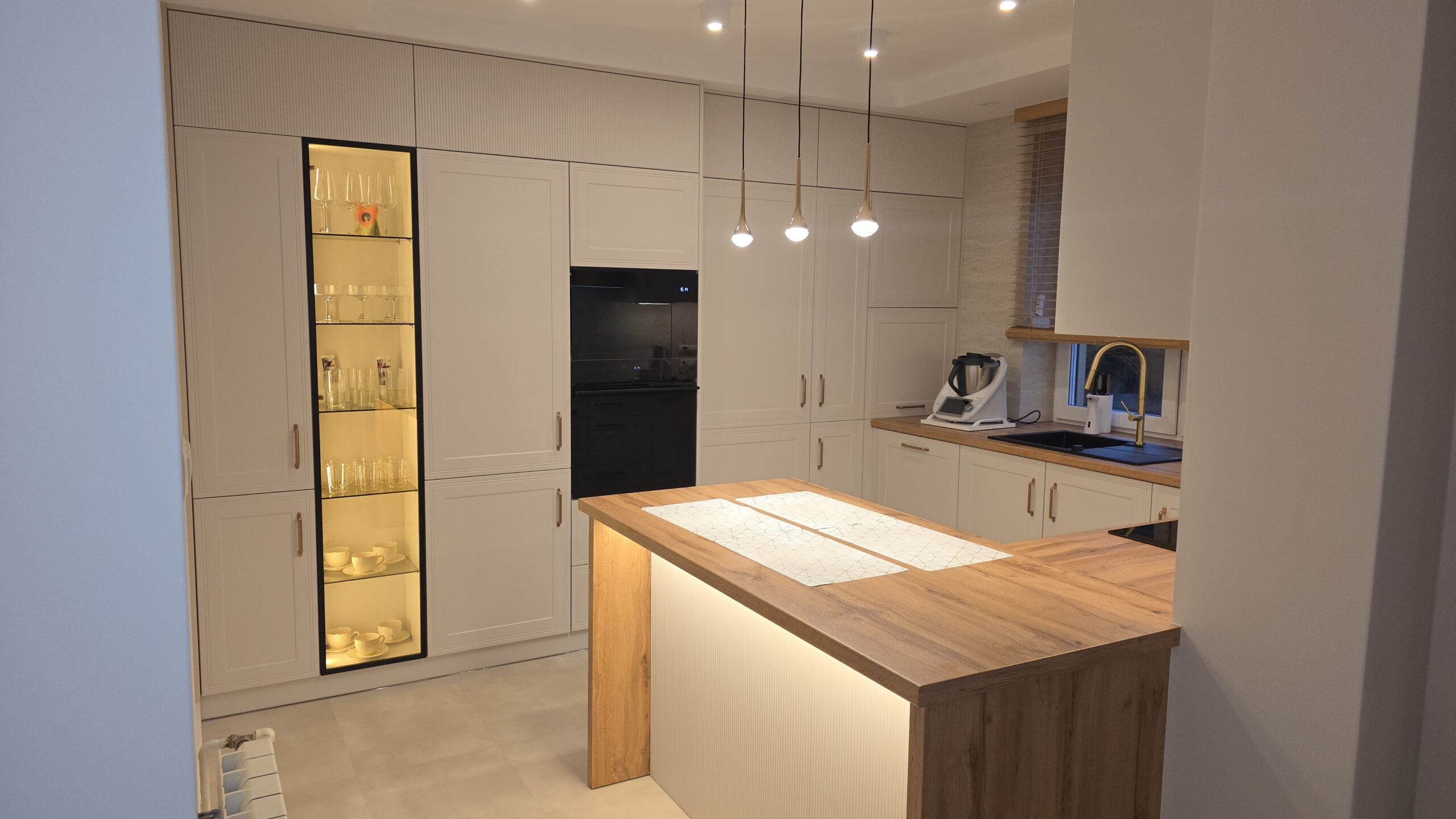 Szczególną uwagę poświęciliśmy ergonomii – wszystkie szafki zostały wyposażone w nowoczesne systemy cichego domykania, a wyspa kuchenna zapewnia dodatkową powierzchnię roboczą oraz miejsce do nieformalnych posiłków.