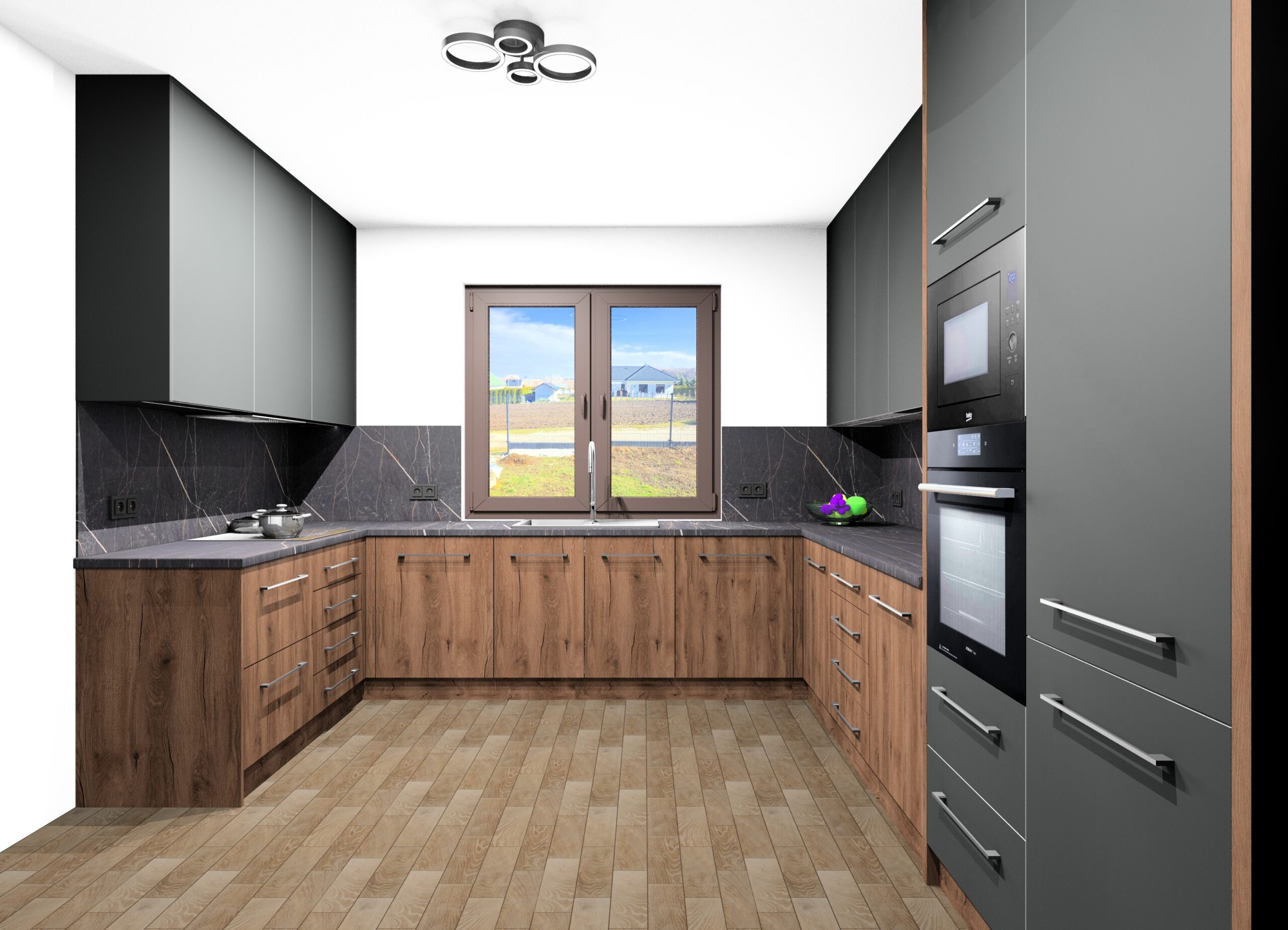 Projekt kuchni został starannie przemyślany, aby maksymalnie wykorzystać dostępną przestrzeń. Zastosowaliśmy wysokiej jakości fronty w kolorze białym, które doskonale kontrastują z ciemnymi blatami z konglomeratu kwarcowego.