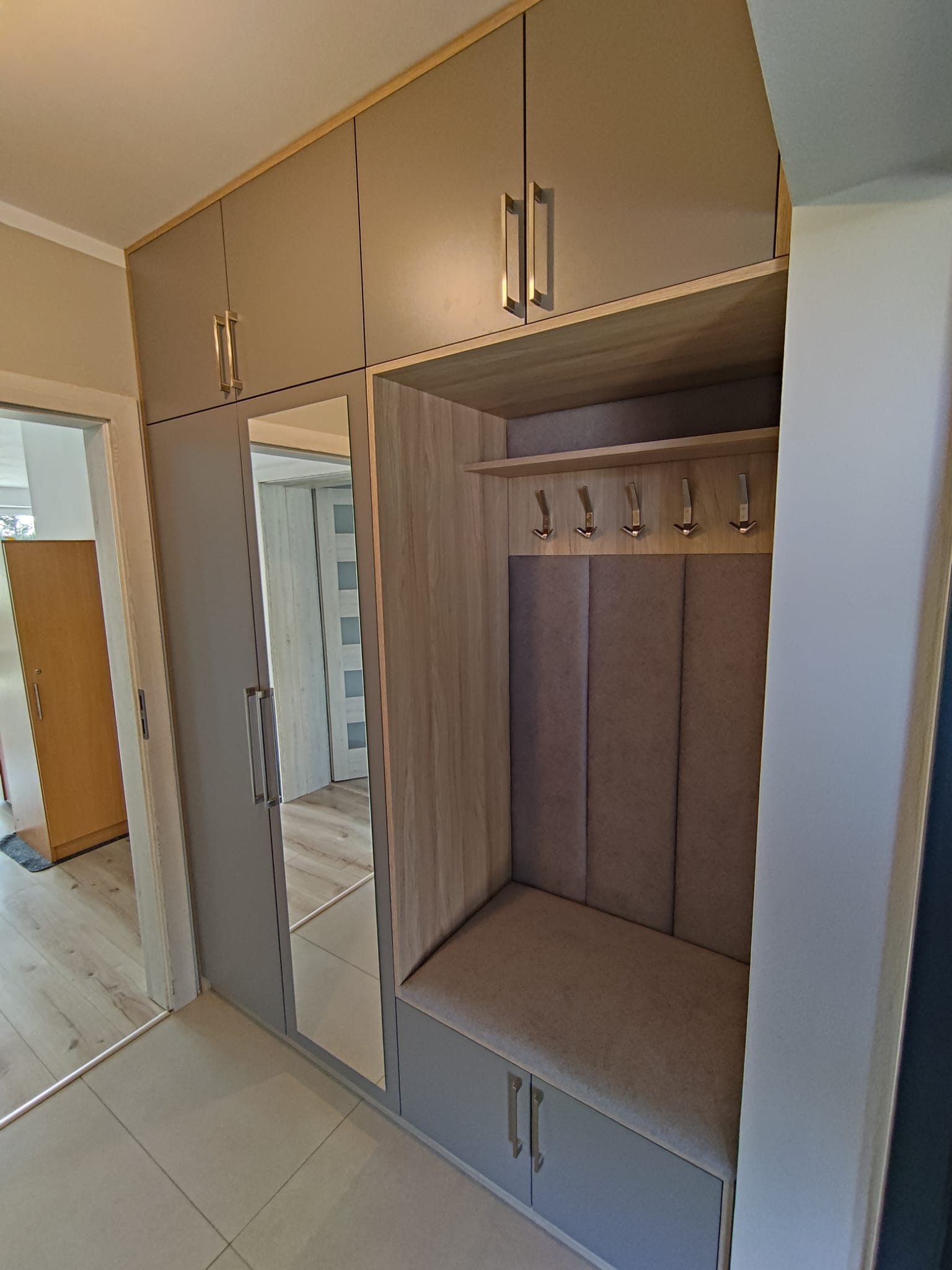Projekt obejmował wykonanie dużych szaf przesuwnych na wymiar, z lustrzanymi frontami, które optycznie powiększają wnętrze i dodają mu lekkości. Wnętrze szaf zostało zaprojektowane z myślą o ergonomii — znalazły się tam liczne półki, szuflady z pełnym wysuwem, drążki na ubrania oraz specjalne moduły na akcesoria.